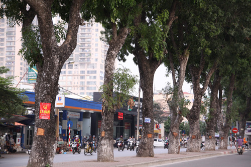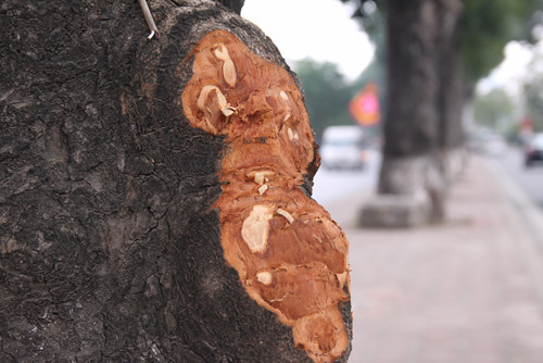 Ông Thành, chủ hiệu cắt tóc bên đường Láng, cho biết việc lột trộm vỏ cây thường diễn ra vào ban đêm nhưng cách đây vài ngày có một số người đi lột giữa ban ngày. Có những đoạn, hàng chục cây liên tiếp bị đục khoét.