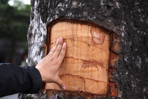 Một vết khoét có hình chữ nhật, chiều dài khoảng 30x40 cm, vết đục sâu vào thân khoảng 2 cm.