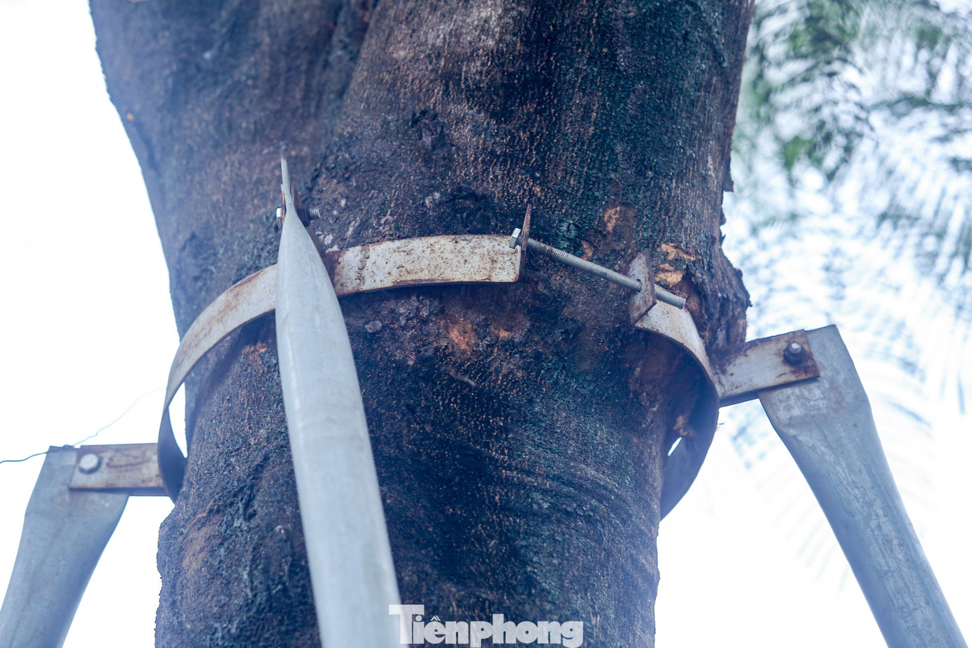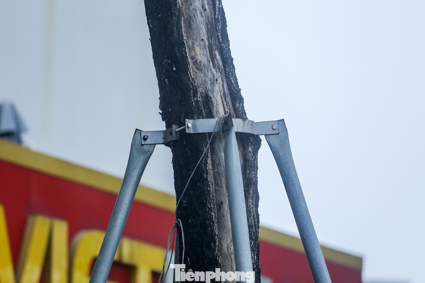 | Hàng cây được chống đỡ bằng cột sắt cao khoảng 2m giúp cây phát triển theo chiều thẳng đứng, tránh gãy đổ khi gặp thời tiết xấu. Tuy nhiên, vòng chống đỡ này đang siết chặt vào thân khi cây ngày càng lớn. |