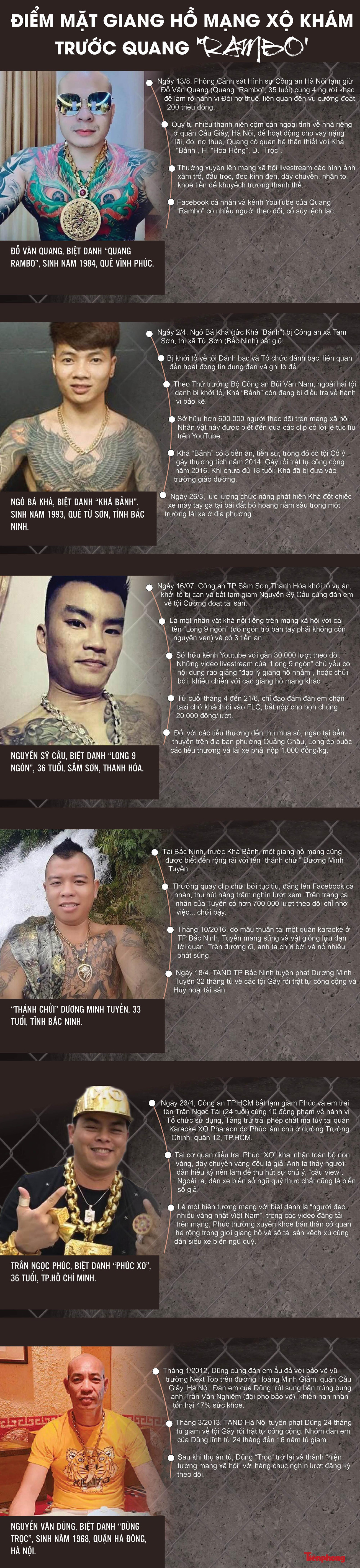 TPO - Trước khi Quang "Rambo" bị bắt, nhiều giang hồ mạng như Khá "Bảnh", "Long 9 ngón", "thánh chửi" Dương Minh Tuyền hay Phúc "XO" cùng đàn em bị công an "sờ gáy".