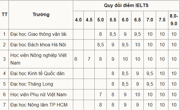 Quy đổi IELTS sang điểm xét tuyển của các trường cụ thể như sau:
