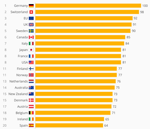 Trên thế giới, đứng đầu danh sách năm nay là Đức, khi được 13 quốc gia lựa chọn là đáng tin cậy nhất. Sản phẩm của doanh nghiệp nước này được đánh giá cao nhất thế giới về Chất lượng, bất chấp scandal gian lận khí thải của Volkswagen năm ngoái. Họ đạt điểm cao nhất (100), theo sau là Thụy Sĩ (98) và EU (92).