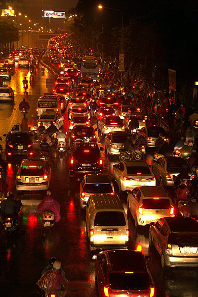 Đèn phanh của phương tiện đỏ rực cả tuyến đường.