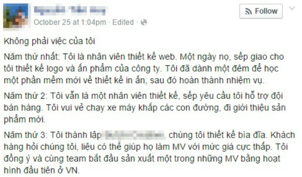 "Năm thứ nhất: Tôi là nhân viên thiết kế web. Một ngày nọ, sếp giao cho tôi thiết kế logo và ấn phẩm của công ty. Tôi đã dành một đêm để học một phần mềm mới về thiết kế in ấn, sau đó hoàn thành nhiệm vụ.