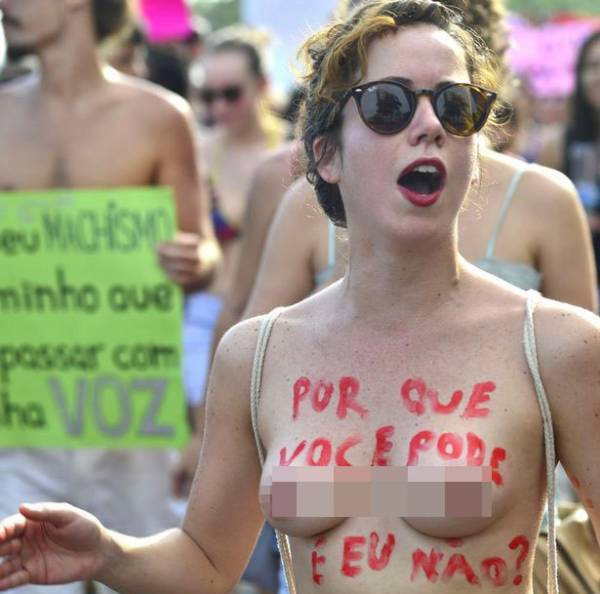 Thông điệp phản đối nạn cưỡng dâm và bạo hành được những phụ nữ Brazil cầm trên tay hoặc tự vẽ lên ngực, bụng, lưng, cánh tay. Họ thậm chí vừa biểu diễn những bài nhảy samba sôi động vừa...biểu tình.