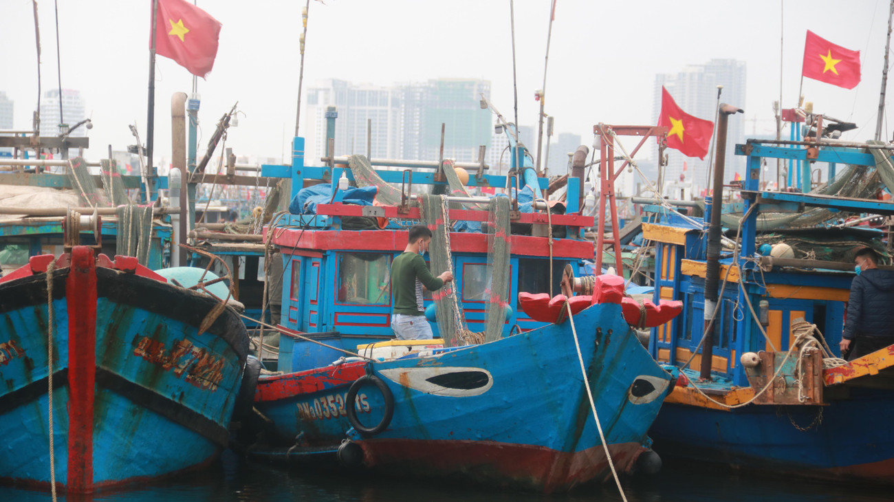| Ngư dân kiểm tra tàu thuyền neo đậu bên trong âu thuyền Thọ Quang. |