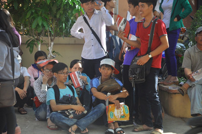 Theo kế hoạch, 7 giờ 45, điểm thi mới mở cửa cho thí sinh vào nhưng do đến sớm nên nhiều thí sinh phải ngồi đợi trước cổng trường.