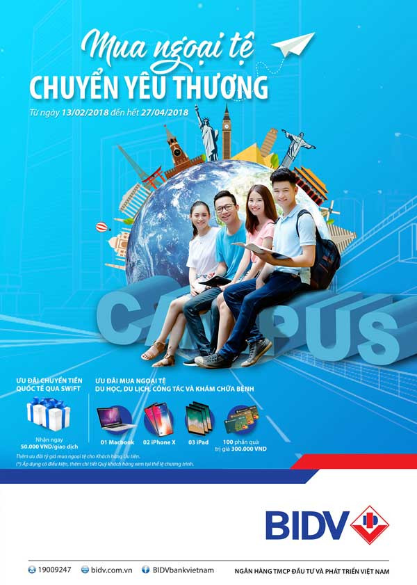 Từ nay đến hết 27/4/2018, khi mua ngoại tệ tại BIDV, khách hàng có cơ hội nhận các quà tặng giá trị như Macbook Pro đẳng cấp, iPhoneX sành điệu, iPad thời thượng, hàng trăm phần quà trị giá 300.000 VND và ưu đãi tỷ giá dành tặng các khách hàng ưu tiên của BIDV. Thêm hấp dẫn nữa là khách hàng nhận ngay quà tặng tiền mặt 50.000 VND khi chuyển tiền quốc tế qua SWIFT.