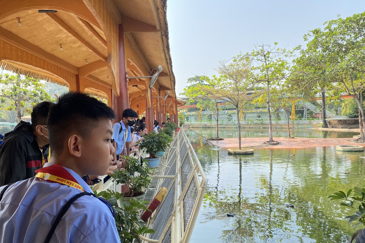 | Các em trải nghiệm câu cá sấu trong khu du lịch. |