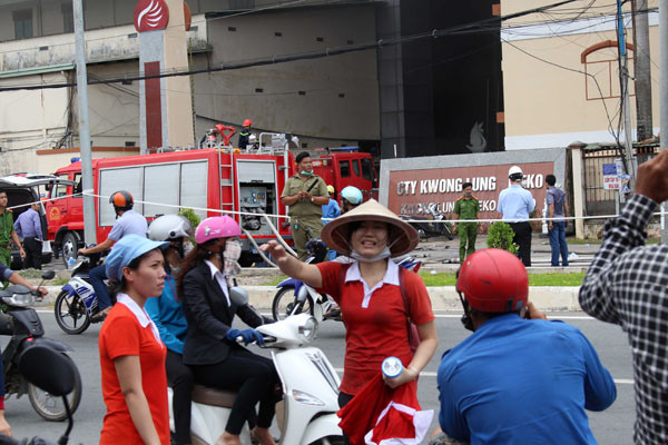 Còn bà Lê Thị Phượng, công nhân công ty may ngồi thất thần ven đường. Khi phát hiện ngọn lửa bùng phát ở kho trên tầng 5, mọi người la hét rồi mạnh ai nấy chạy từ tầng 5 xuống đất. Bảo vệ lấy bình chữa cháy mini dập lửa nhưng chẳng ăn thua.