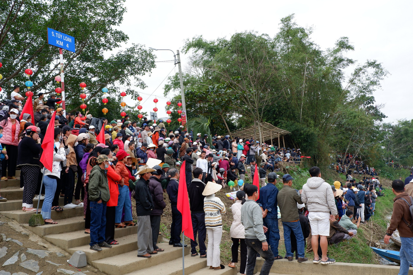 Dọc sông Túy Loan là các bãi bồi màu mỡ, dân làng nghỉ công việc đồng áng để theo dõi và cổ vũ cho thuyền của làng mình.