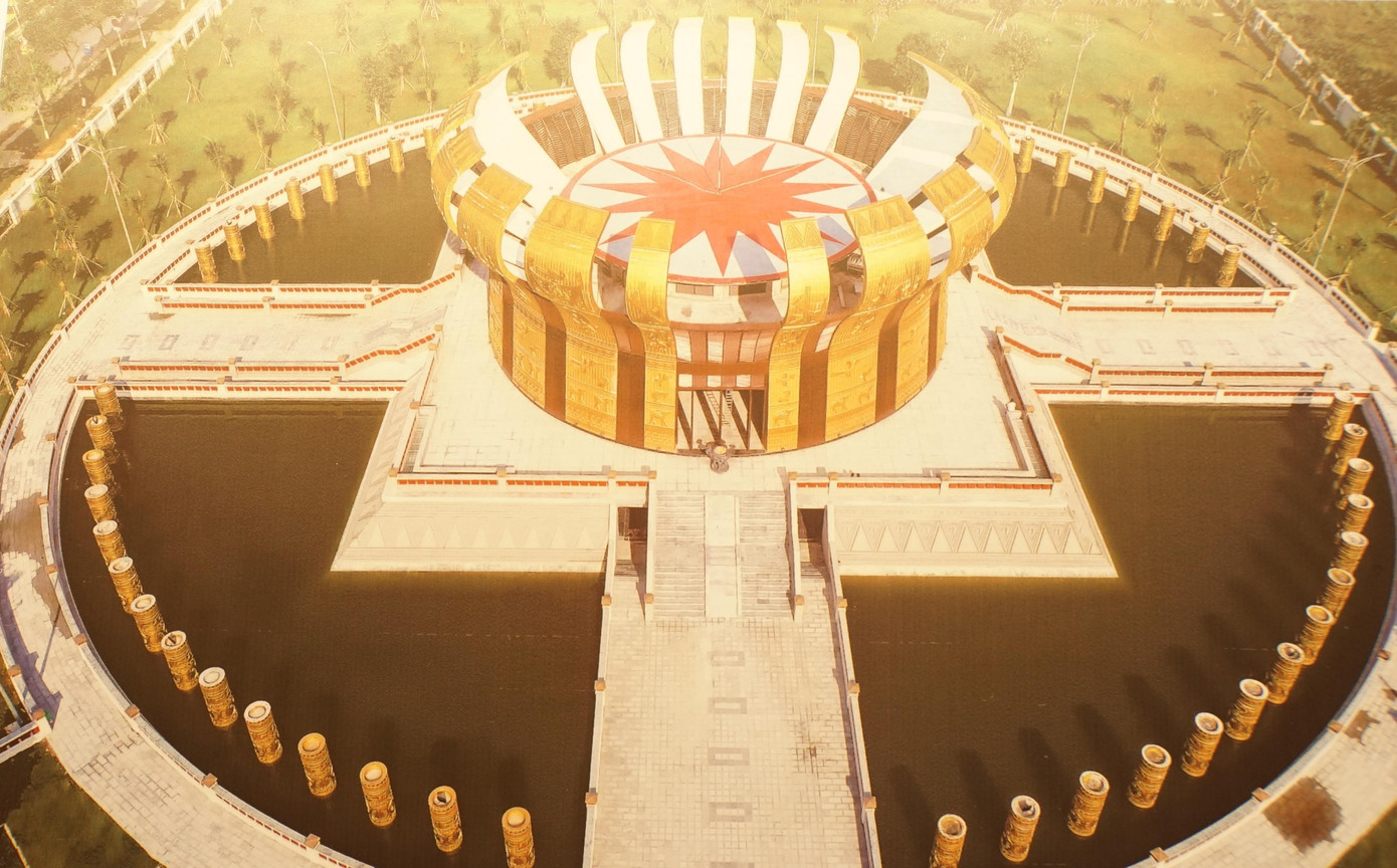 | Bao quanh đền thờ chính là 54 khối cột hình trụ cao 4,5 mét, đường kính một mét; kết thành vòng tròn trong hồ điều hòa, các trụ cột tượng trưng cho cộng đồng 54 dân tộc Việt Nam. - Ảnh: Hòa Hội |