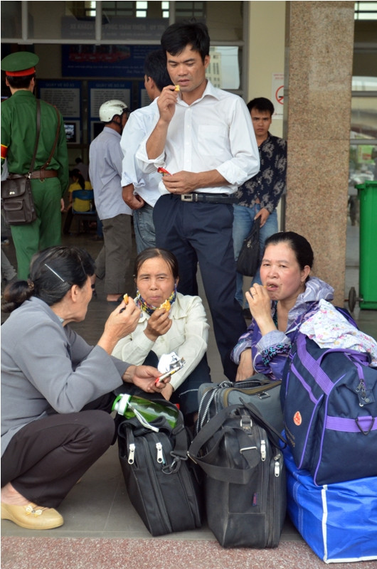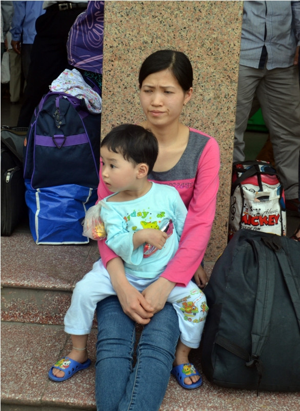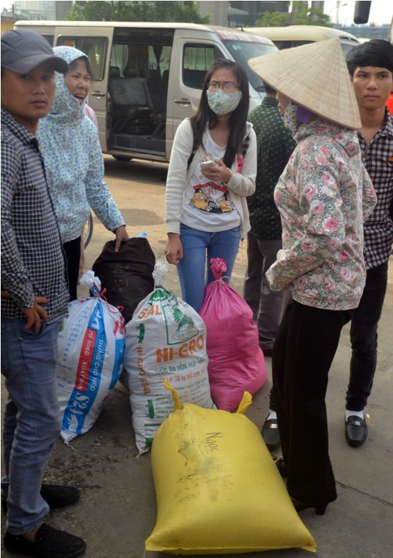 Nhiều người mệt nhoài mang vác đồ từ quê ra.