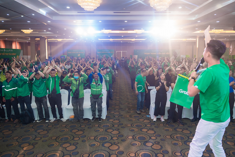 | Từ sáng sớm, màu xanh Grab đã phủ kín tòa nhà CTM Palace (Hà Nội), cùng tiếng cười của các bác tài tràn ngập. |