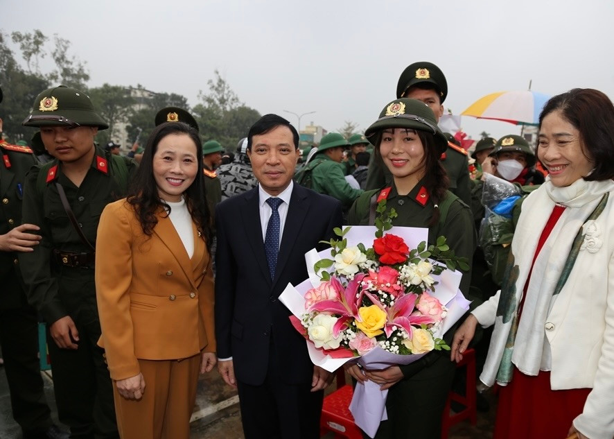 | Chủ tịch UBND tỉnh Đỗ Minh Tuấn cùng các đại biểu động viên các tân binh tại TP. Thanh Hoá lên đường nhập ngũ. |