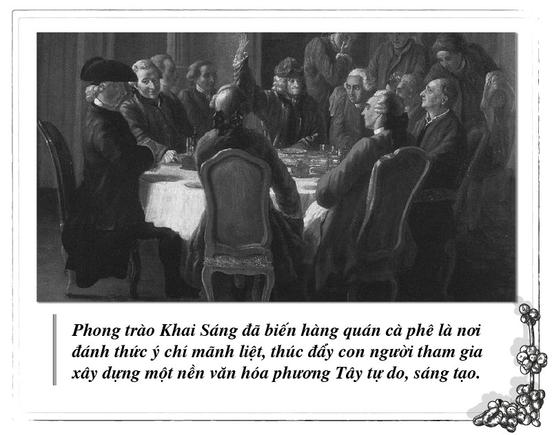 Cùng với sự hình thành và phát triển của phong trào Khai sáng, từ thế kỷ 17, cà phê và hàng quán cà phê du nhập vào châu Âu và đóng vai trò quan trọng như một môi trường xã hội hóa lý tưởng. Nơi đây những con người trí thức khởi xuất ý tưởng, chuyển hóa tư duy và lan tỏa những tư tưởng, sáng kiến, truyền bá tri thức, thúc đẩy phong trào khai sáng phát triển mạnh mẽ, đặc biệt tại các quốc gia có văn hóa thưởng thức cà phê đặc trưng như Pháp, Ý, Anh, Đức…
