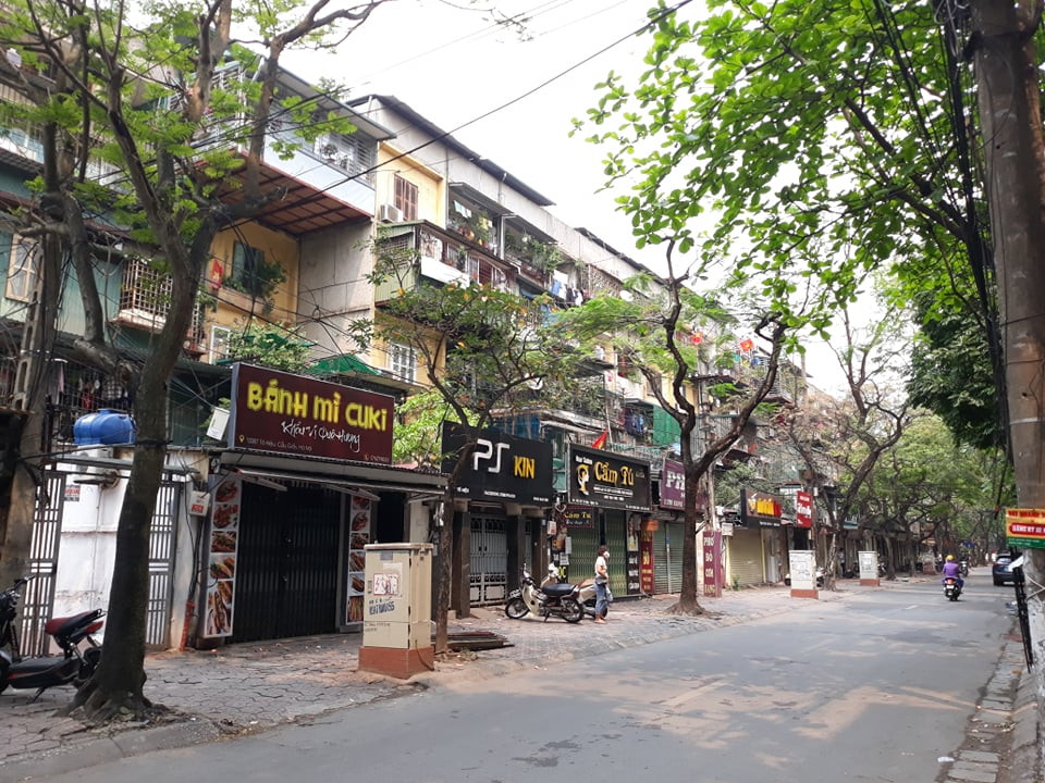 Hàng quán đóng cửa, người dân tăng cường mua thực phẩm nấu ăn tại nhà. Trong ảnh: Tuyến phố Tô Hiệu (Cầu Giấy) vắng vẻ, hàng quán đã đóng