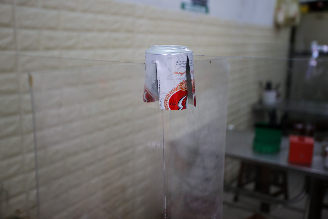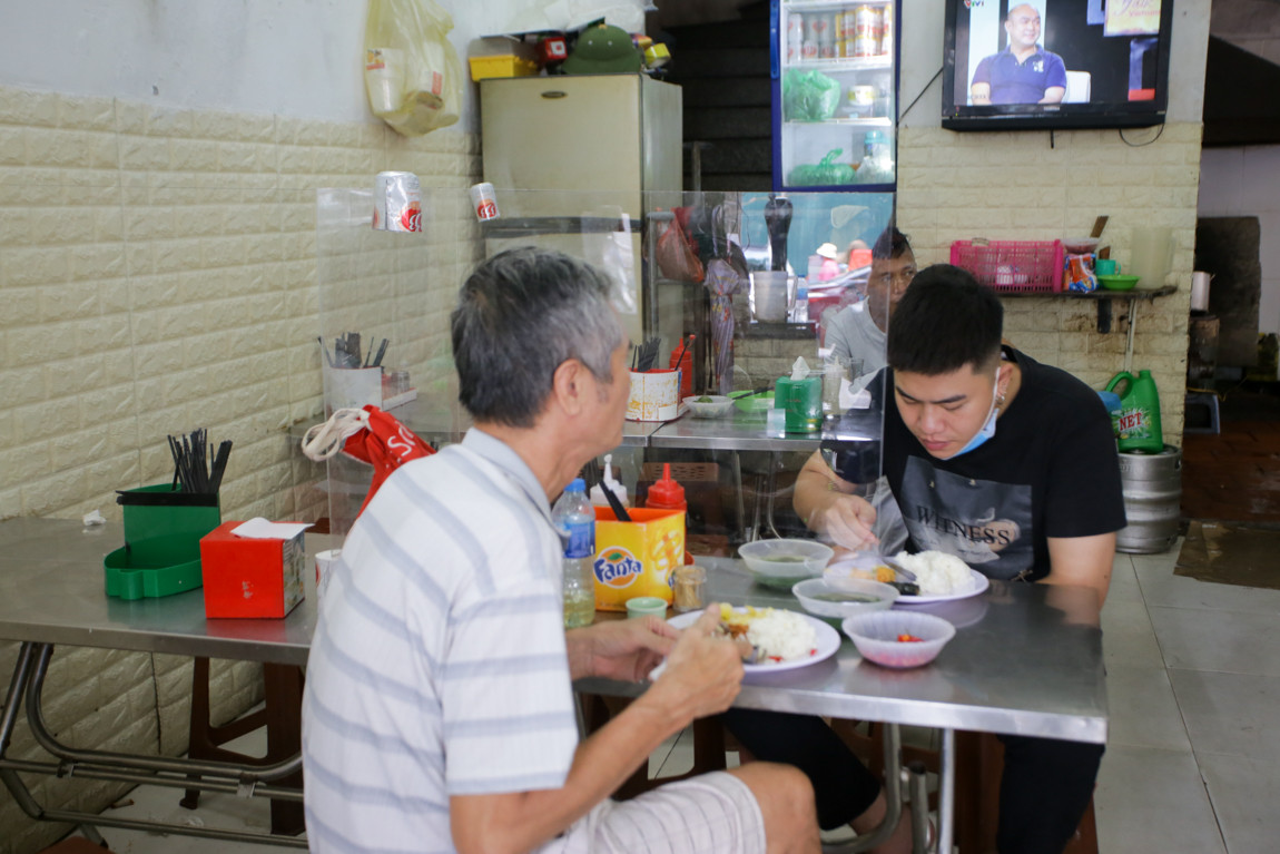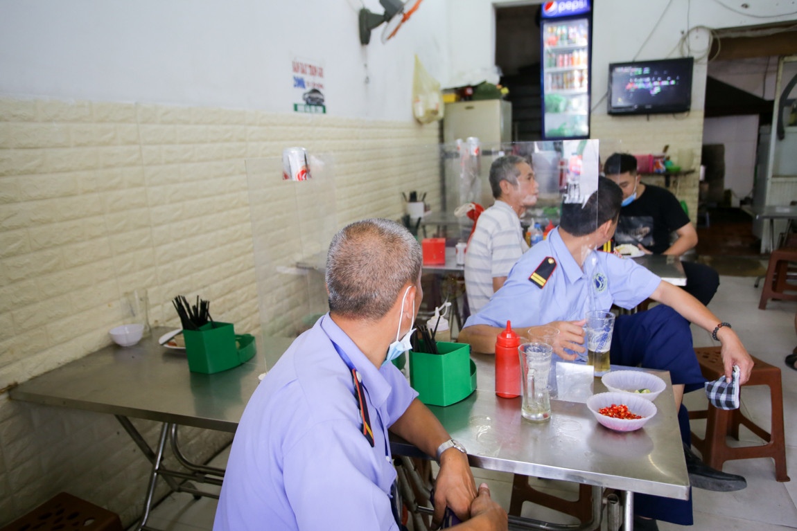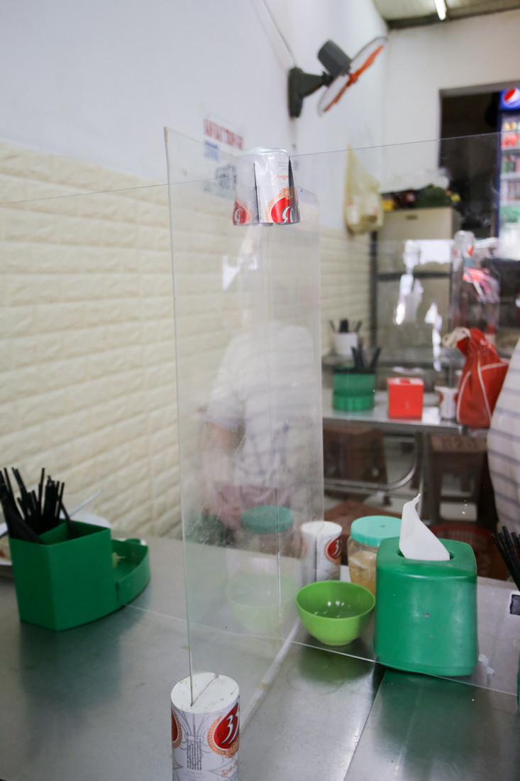 Tại quán cơm bình dân trên phố Phủ Doãn, quán đã chủ động lắp đặt trang bị nhiều vách ngăn mika chia ô cho khách hàng.
