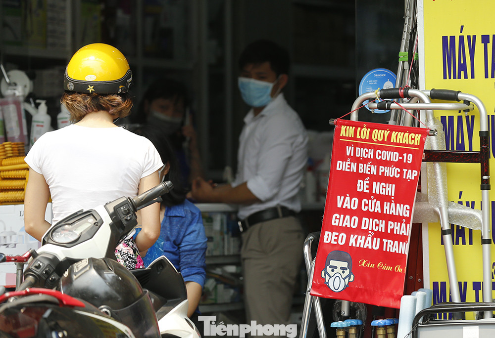 Các cửa hàng vật tư y tế trên đường Phương Mai đều treo biển thông báo vào cửa hàng mua bán khách hàng phải đeo khẩu trang phòng dịch COVID-19