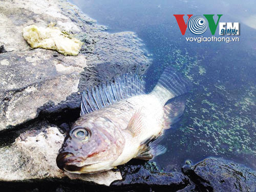 Trên bờ kè đá, xác cá cũng bị sóng đánh dạt vào đang trong quá trình phân hủy bốc mùi hôi thối khó chịu.