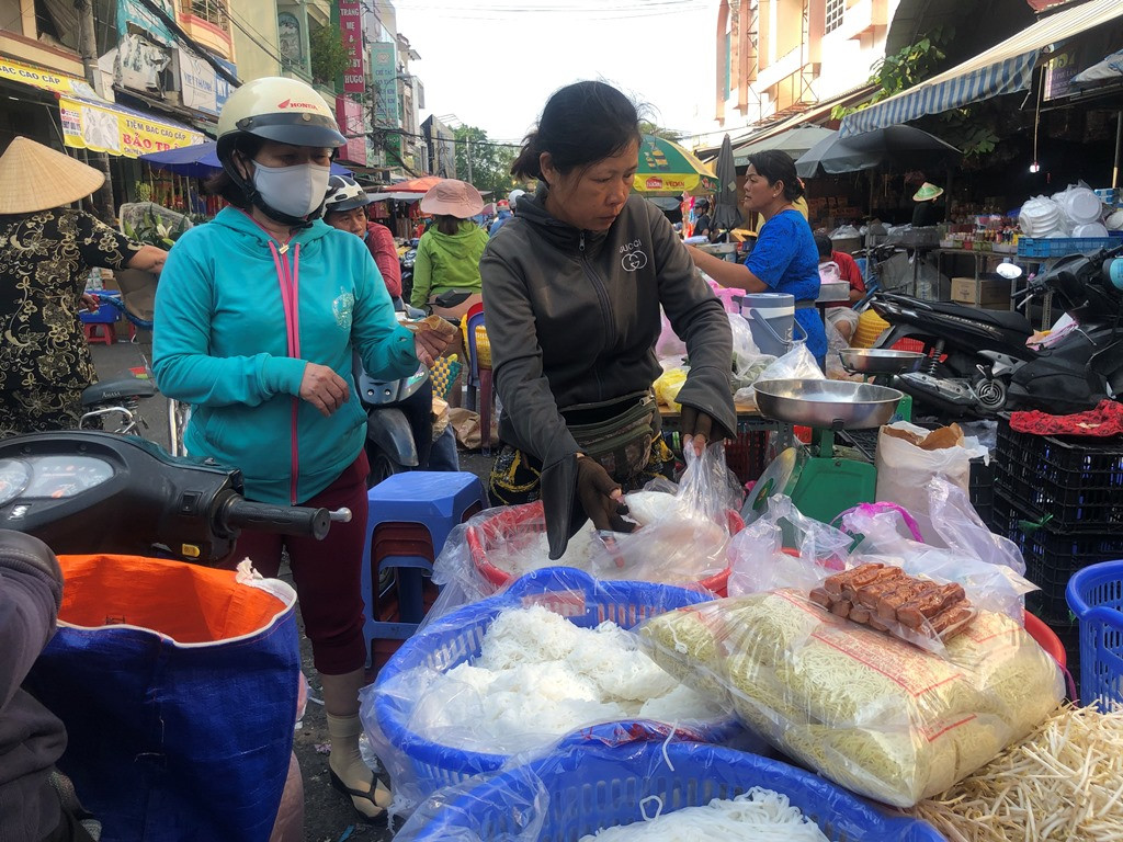 Bún, bánh canh, bánh ướt, mì căn... đắt hàng ngày rằm. Người dân xếp hàng chờ mua.