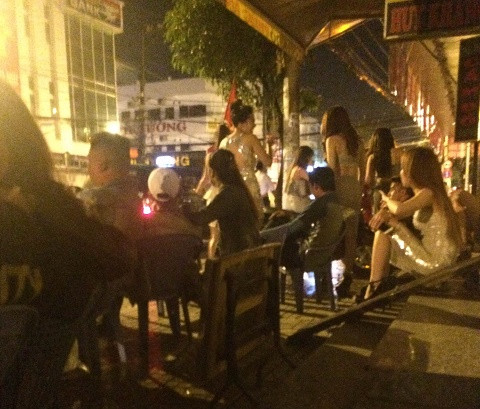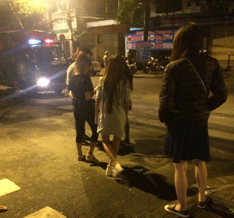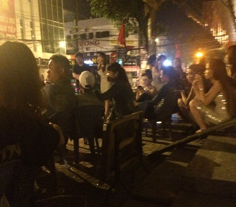 Nhiều cô gái váy ngắn, ăn mặc hở hang ra ngồi vỉa hè sau khi bị kiểm tra hành chính. Ảnh: Phan Cường.
