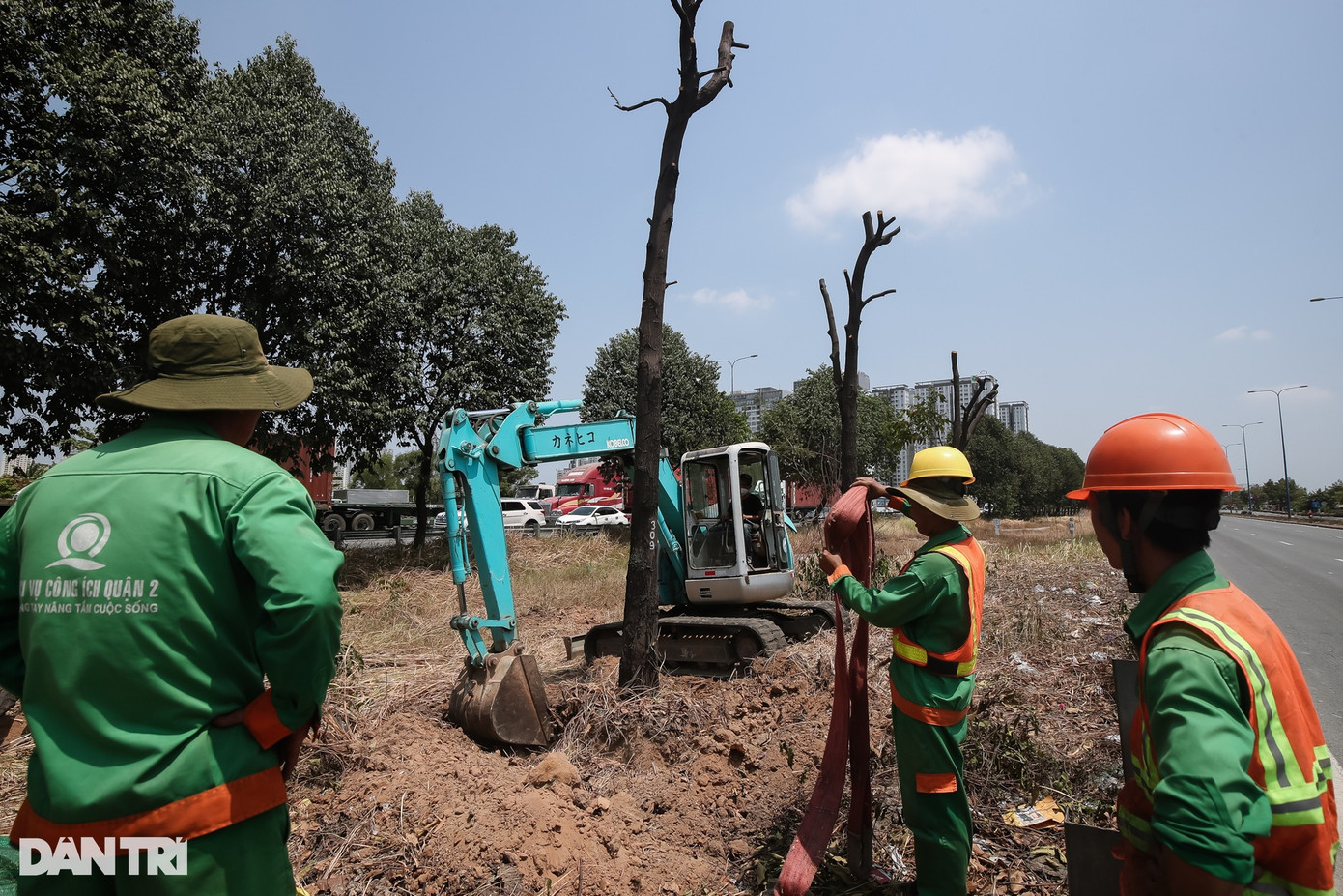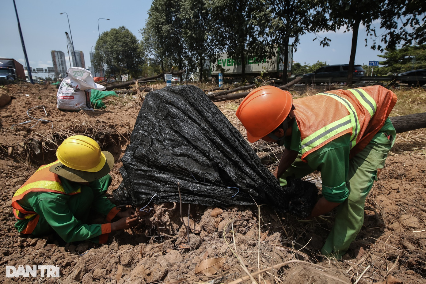 Theo ghi nhận của phóng viên Dân trí, khoảng 15 công nhân chia làm 2 nhóm để thực hiện di dời cây xanh tại khu vực nút giao An Phú.