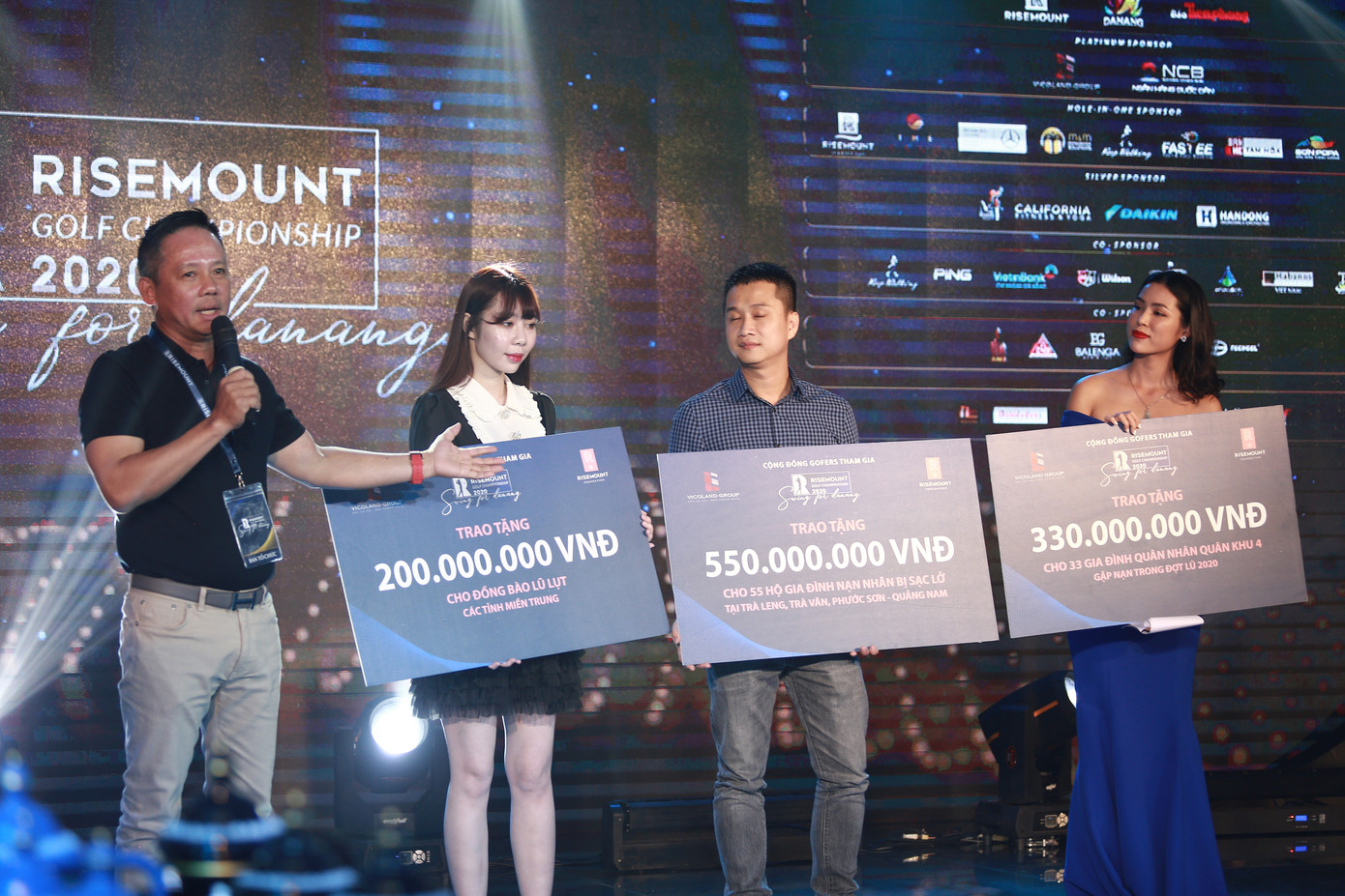 BTC giải Risemount Golf Championship 2020 cũng trao tặng 200 triệu đồng cho đồng bào chịu ảnh hưởng bởi lũ lụt ở các tỉnh miền Trung; 550 triệu đồng cho 55 hộ gia đình nạn nhân bị sạt lở tại xã Trà Leng và Phước Sơn (Quảng Nam); tặng 330 triệu đồng cho gia đình các quân nhân bị nạn trong các vụ sạt lở đất ở Thừa Thiên Huế và Quảng Trị.