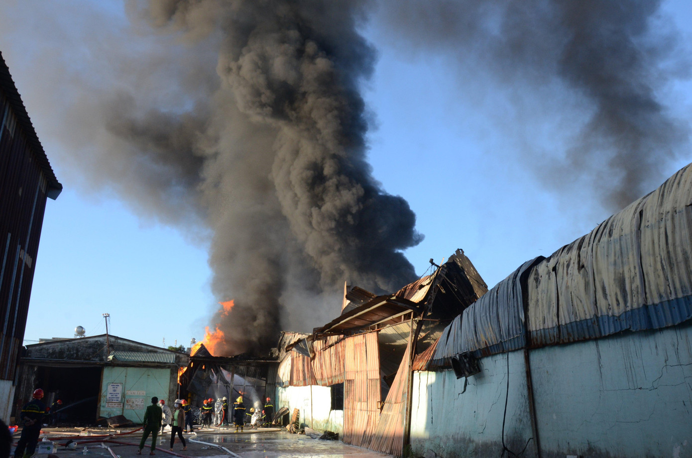 | Vụ cháy xảy ra tại kho vật tư thiết bị của Nhà máy Biến áp Đà Nẵng, cột khói đen cao hàng trăm mét bao trùm trên khu dân cư xung quanh. |