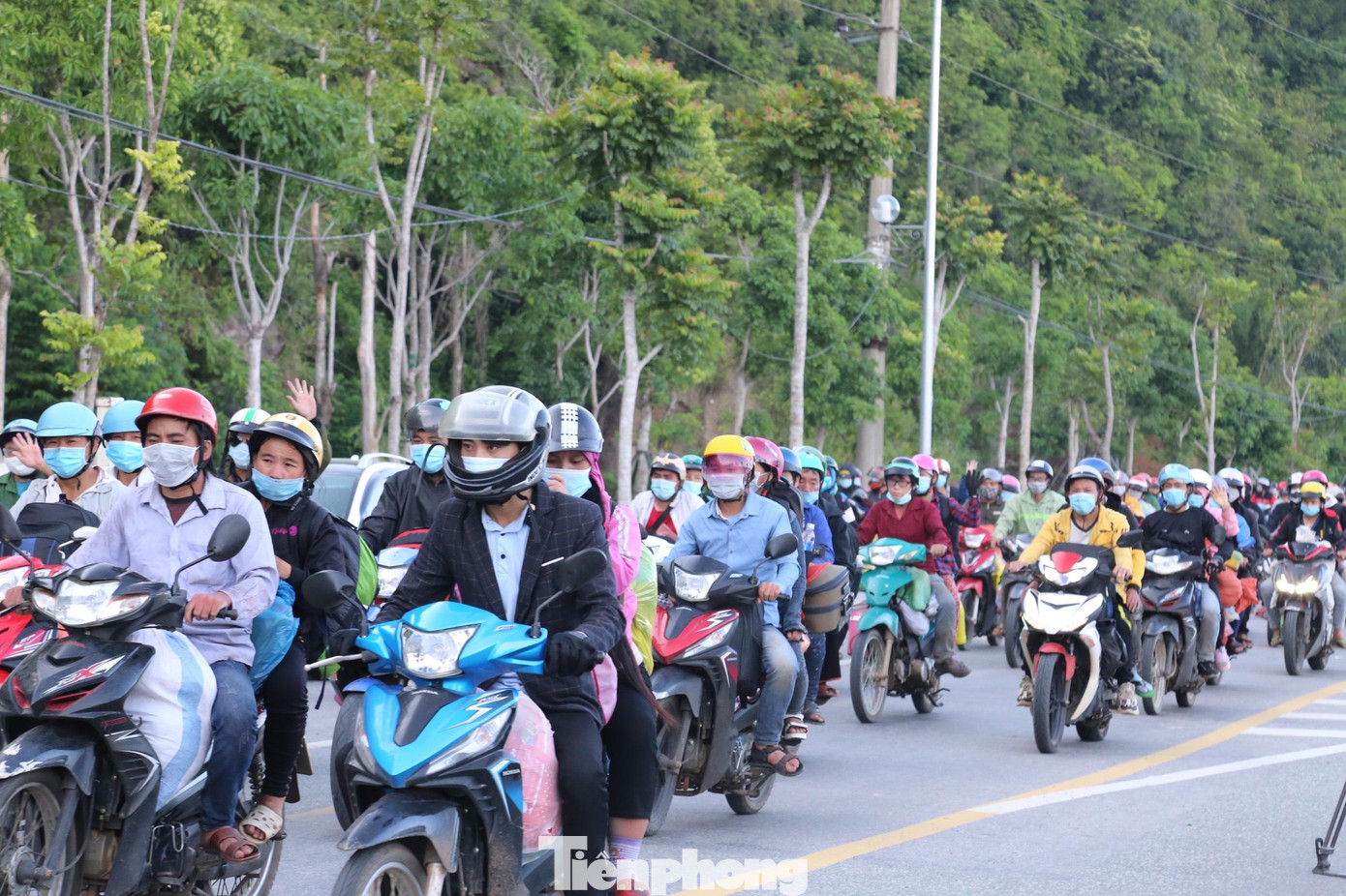 Chiều 4/10, một đoàn người đi hơn 300 xe máy từ các tỉnh phía Nam nối đuôi nhau về tới cầu Bến Thủy 2. Đoàn xe được hướng dẫn chạy vào tuyến đường ven núi Quyết để dễ kiểm soát, tránh ùn tắc. Tất cả những người này đều là công nhân ở các tỉnh phía Nam về quê tránh dịch.