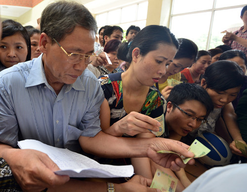 Đúng 14h, những bộ hồ sơ vào lớp 6 được chuyển ra. Ban tuyển sinh đã lên danh sách người đến sớm để bán theo thứ tự. Tuy nhiên, với tâm lý lo lắng, nhiều cha mẹ ùa lên chen lấn. Phải 30 phút sau, khi người mua đã vãn, phụ huynh mới trật tự đứng thành hai hàng dài khoảng 10 m đến tận cầu thang lên tầng 2 của trường.