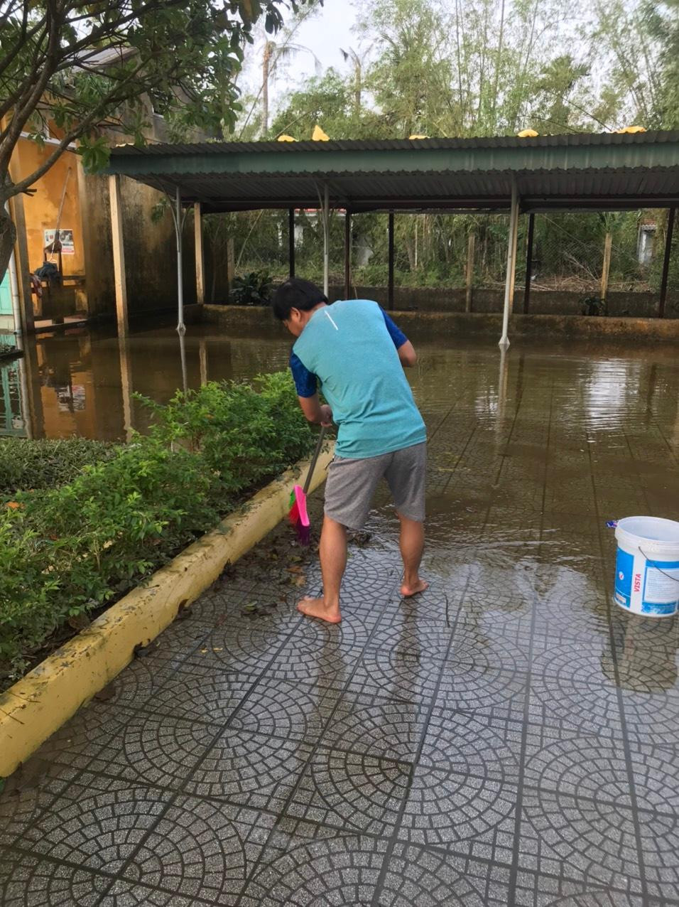 | Tranh thủ làm vệ sinh trường lớp khi lũ rút xuống thấp. |