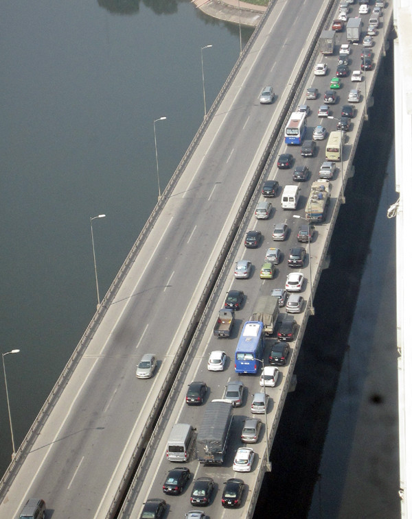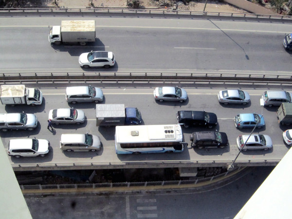 Cả 3 làn xe trên cầu cạn đều ken đặc ô tô.