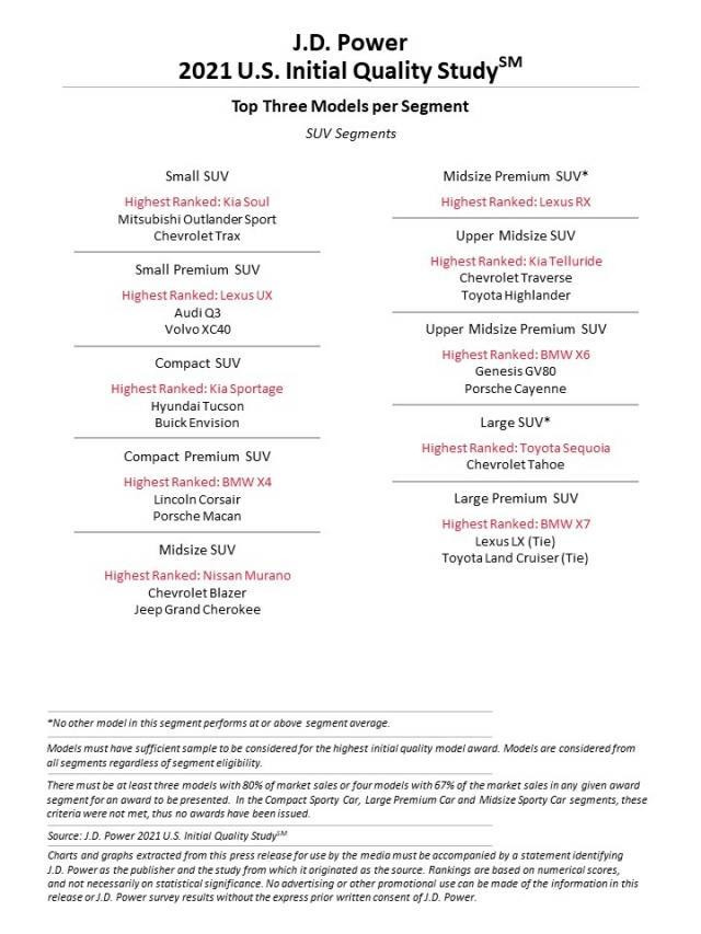 Nghiên cứu chất lượng ban đầu được J.D.Power thực hiện nhằm đo lường tỷ lệ vấn đề gặp phải trên 100 xe (PP100) trong 90 ngày đầu tiên sử dụng. Năm nay, khảo sát được thực hiện đối với 110.827 chủ sở hữu của các mẫu xe đời 2021. Điểm càng thấp sẽ càng được xếp hạng cao, mức trung bình của ngành là 162 PP100, cao hơn 4 PP100 so với năm 2020.