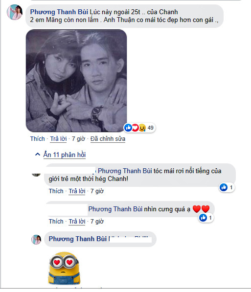 “Lúc này Chanh ngoài 25 tuổi, 2 em còn non lắm. Anh Thuận có mái tóc đẹp hơn con gái”, Phương Thanh chú thích dưới bức ảnh đen trắng thời con trẻ của cô và Minh Thuận.