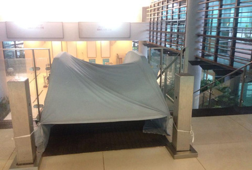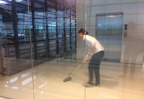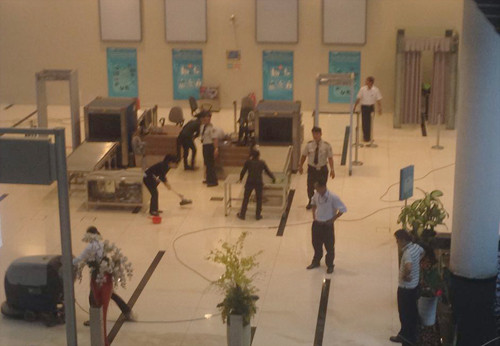 Do thiết kế nhà kính kết hợp các tấm gỗ thưa nên mỗi khi có cơn mưa lớn khu nhà làm thủ tục ở sân bay Buôn Ma Thuột, tỉnh Đắk Lăk bị nước hắt ướt vào tận bên trong. Hình ảnh trên ghi lại vào chiều ngày 4/9, khu vực kiểm tra hành lý do nước mưa ướt nên phải huy động nhân viên ra lau dọn.