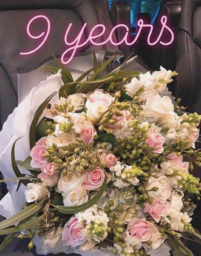 Tăng Thanh Hà khoe bó hoa to được chồng tặng nhân kỷ niệm 9 bên nhau.