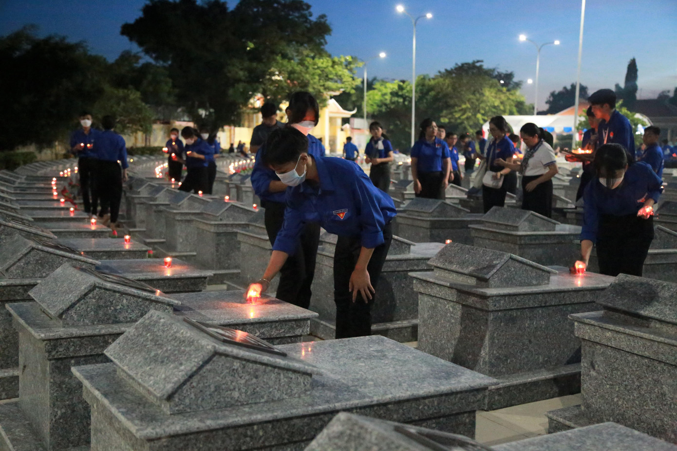 | Các bạn đoàn viên thanh niên, sinh viên Học viện Cán bộ TPHCM và huyện Trà Cú thắp nến tri ân các Anh hùng liệt sĩ. |