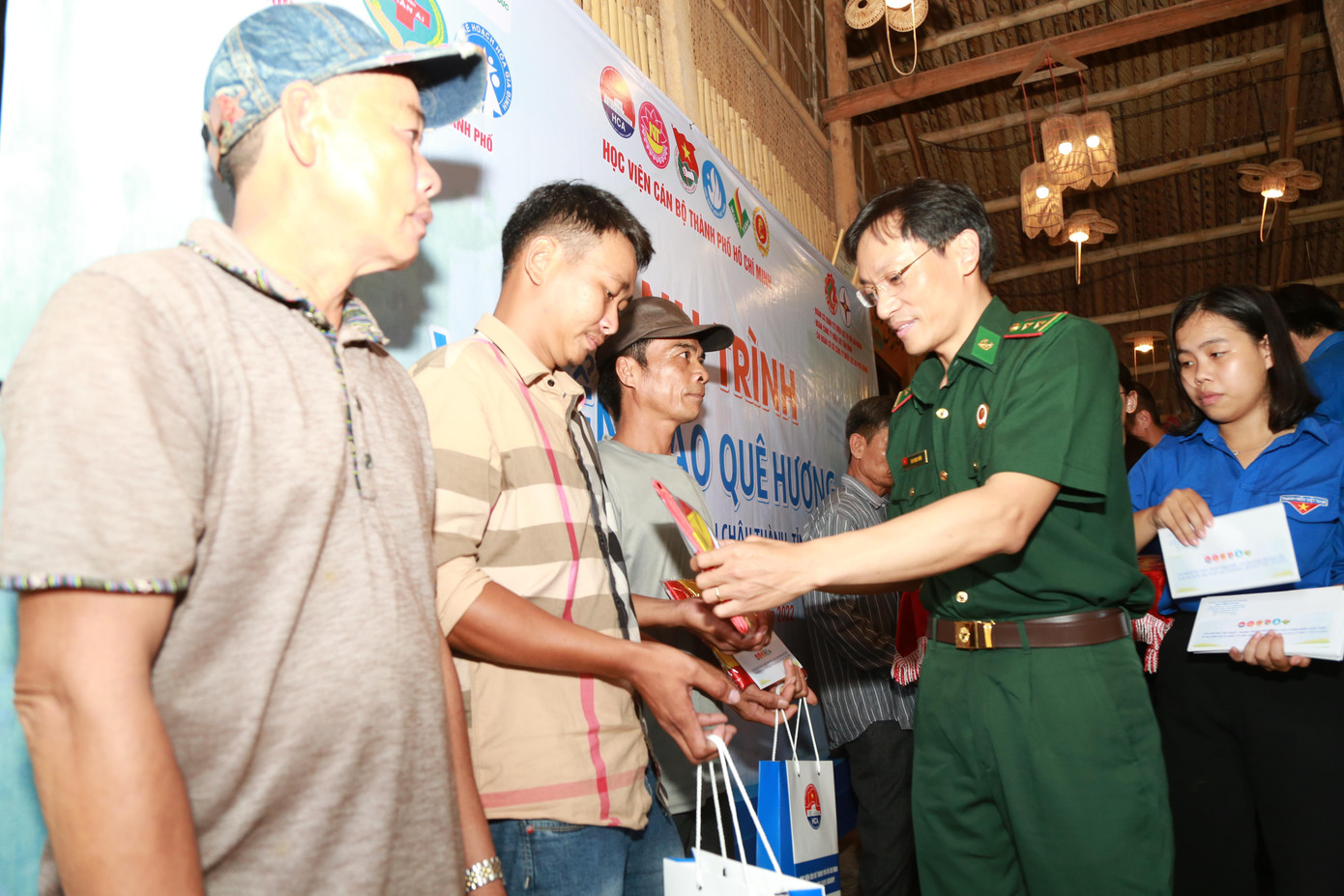 | Đại diện Ban Thường vụ Đảng ủy, Hội Cựu chiến binh Học viện Cán bộ TPHCM trao quà cho các hộ gia đình chính sách, khó khăn trên địa bàn xã đảo Hòa Minh. |