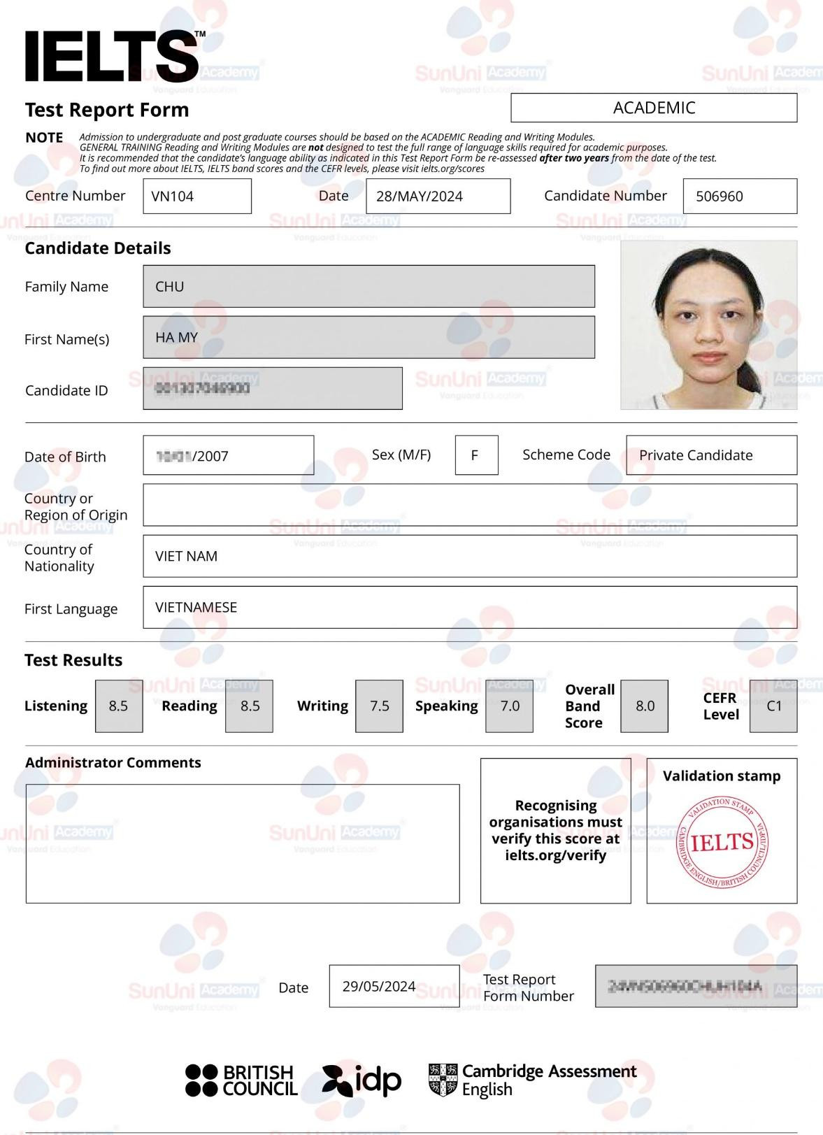 Nhờ kiên trì với mục tiêu và thực hành các kỹ năng tiếng Anh theo phương pháp Kaizen của SunUni Academy cùng sự hỗ trợ của đội ngũ các thầy, cô, My đã tiến bộ vượt bậc. Sau 6 tháng học tập chăm chỉ, em đã đạt 6.5 trong kỳ thi thử đầu ra tại SunUni Academy như mong đợi. Không dừng lại ở đó, với nền tảng được trang bị chắc chắn, My quyết tâm ôn luyện thêm 3 tháng và xuất sắc đạt 8.0 trong kỳ thi IELTS chính thức tại IDP – một thành tích mà My không ngờ tới khi mới bắt đầu hành trình này.