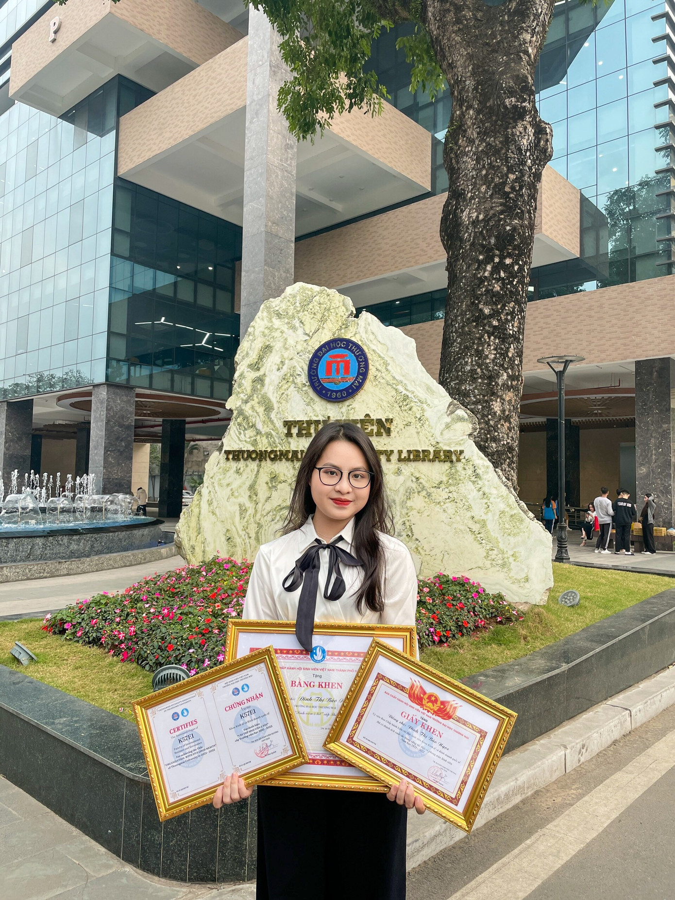 Và dường như mọi sự nỗ lực đều sẽ được đền đáp xứng đáng; ngày 9/1/2023, mình là 1 trong 54 sinh viên của Trường Đại học Thương mại vinh dự được lên nhận bằng khen của Hội sinh viên Thành phố Hà Nội về danh hiệu “Sinh viên 5 tốt”. Khoảnh khắc cầm trên tay tấm bằng khen khiến mình rất đỗi tự hào vì đây không chỉ là một sự công nhận xứng đáng cho những nỗ lực, cố gắng của bản thân mình mà còn là sự cố gắng của cả một tập thể. Để có những trái ngọt ấy, mình đã nhận được sự hỗ trợ tạo điều kiện từ Đoàn Thanh niên và Ban Giám hiệu Trường Đại học Thương mại; sự giúp đỡ của Hội sinh viên Việt Nam Trường Đại học Thương mại cũng như Liên chi Hội sinh viên Khoa Kinh tế và Kinh doanh quốc tế trong việc hoàn thiện các thủ tục, hồ sơ.