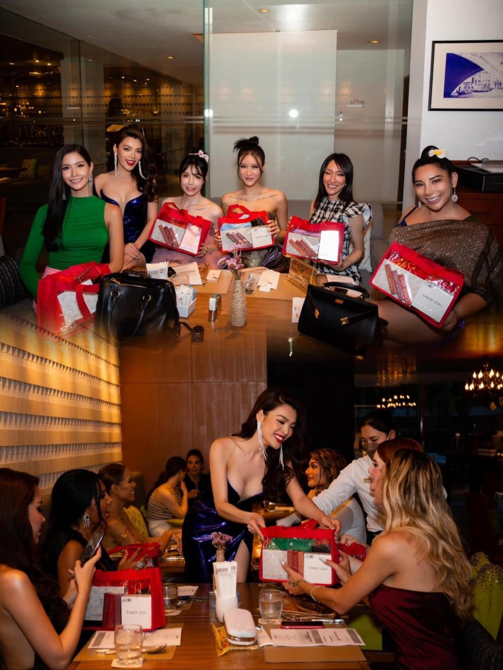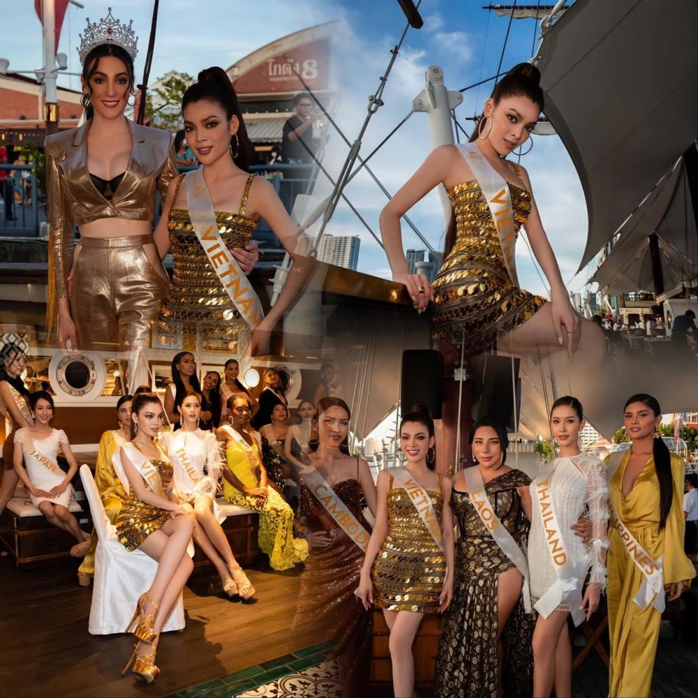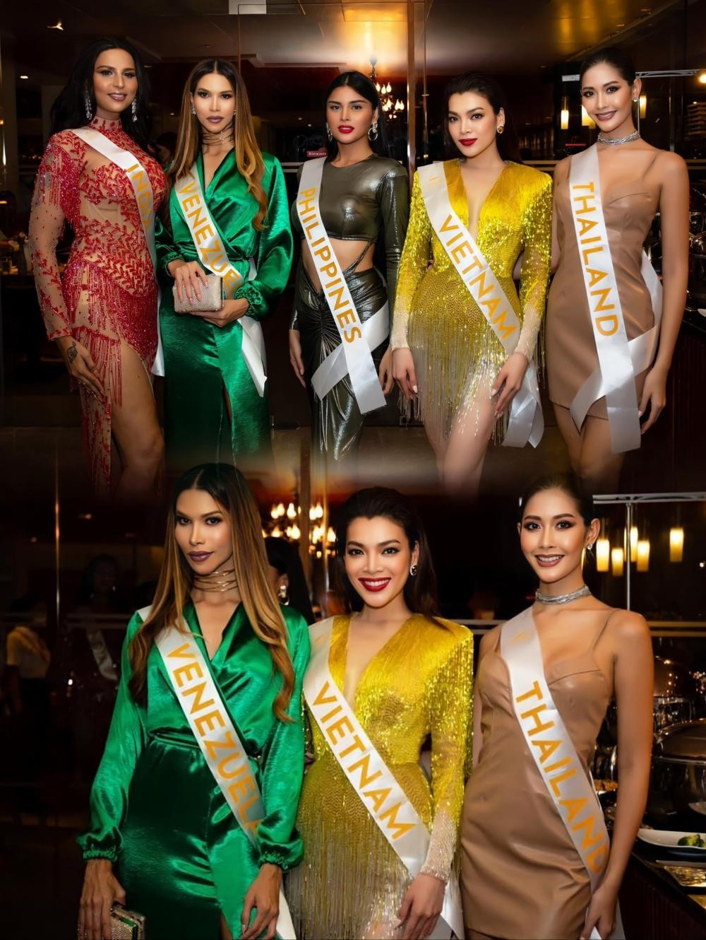 Tấm ảnh "gây sốt" cộng đồng mạng khi Trân Đài khoe sắc cùng các đại diện đến từ Thái Lan, Philippines, Venenzuela, Ấn Độ trong bữa tiệc tối tại Thái Lan. Trân Đài nổi bật khi diện thiết kế màu vàng kim tuyến khoe trọn đôi chân dài miên man.