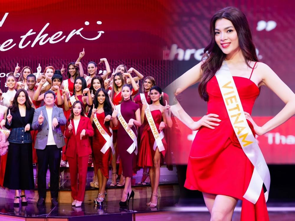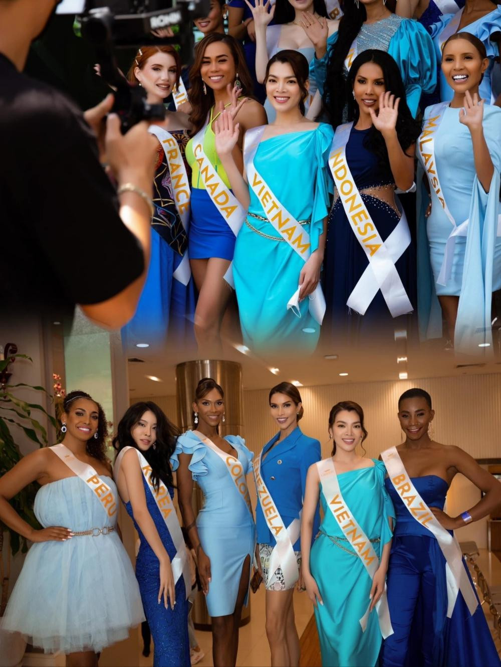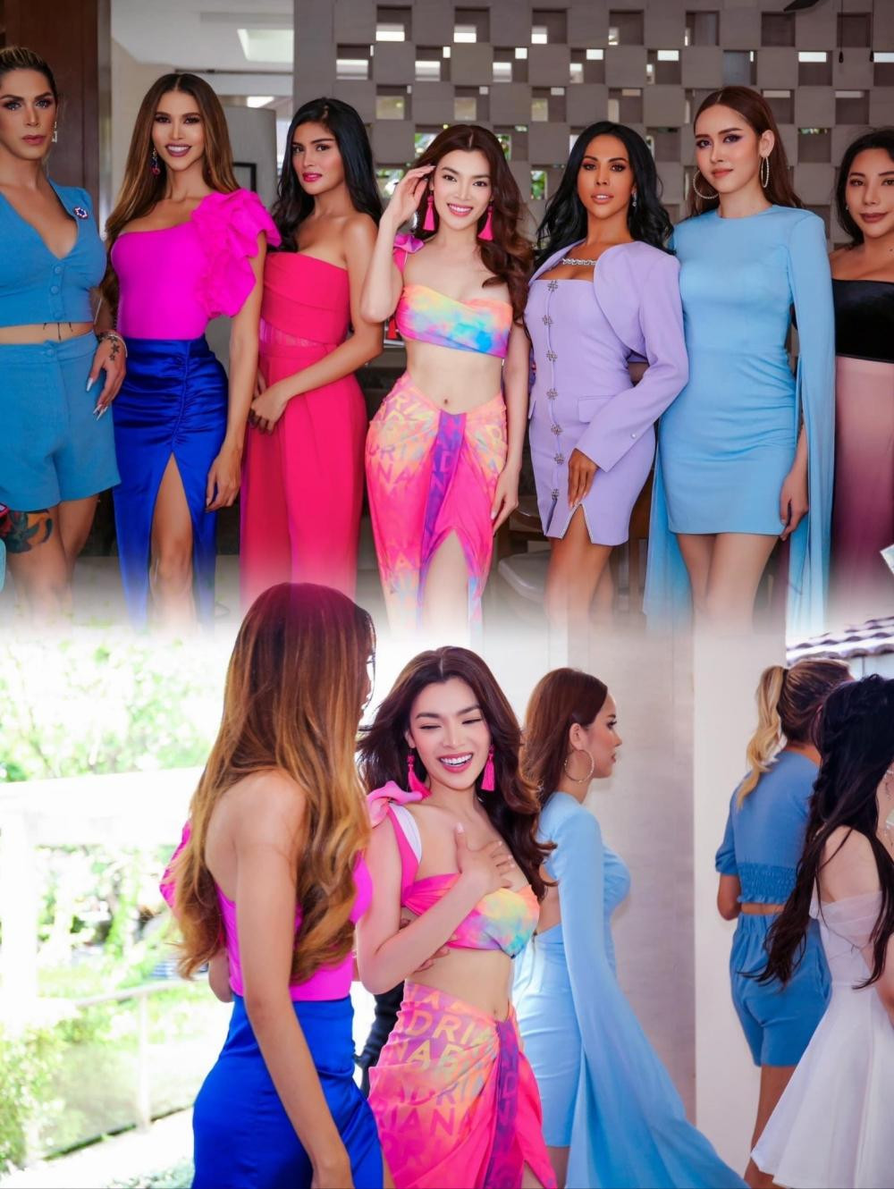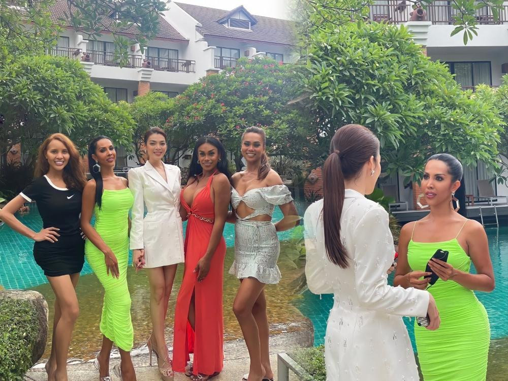 Tấm ảnh "gây sốt" cộng đồng mạng khi Trân Đài khoe sắc cùng các đại diện đến từ Thái Lan, Philippines, Venenzuela, Ấn Độ trong bữa tiệc tối tại Thái Lan. Trân Đài nổi bật khi diện thiết kế màu vàng kim tuyến khoe trọn đôi chân dài miên man.