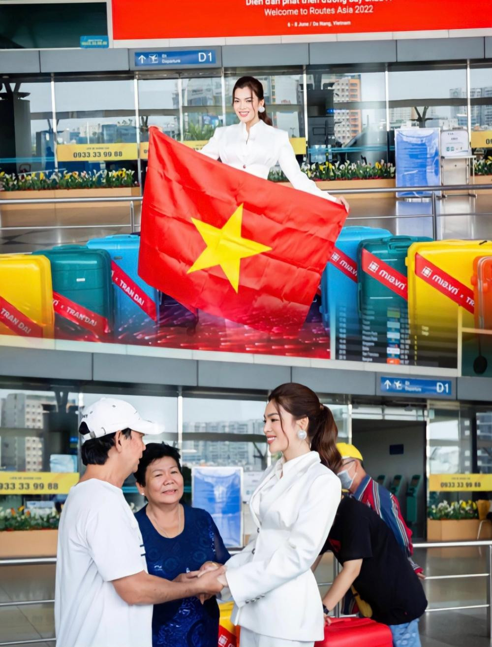 Có mặt tại sân bay Thái Lan, Trân Đài mang khẩu trang in hình cờ đỏ sao vàng và tự hào giơ cao lá cờ Việt Nam. Trân Đài đã sẵn sàng cho hành trình chinh phục vương miện tại Miss International Queen 2022.