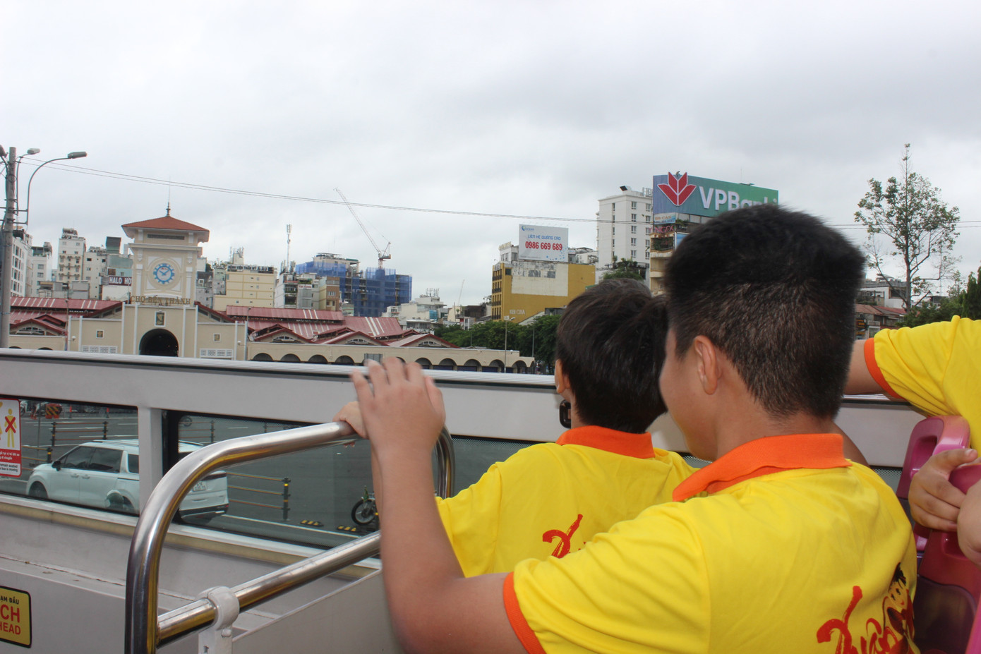 | Các bạn nhỏ thích thú khi lần đầu được trải nghiệm xe buýt 2 tầng. |
