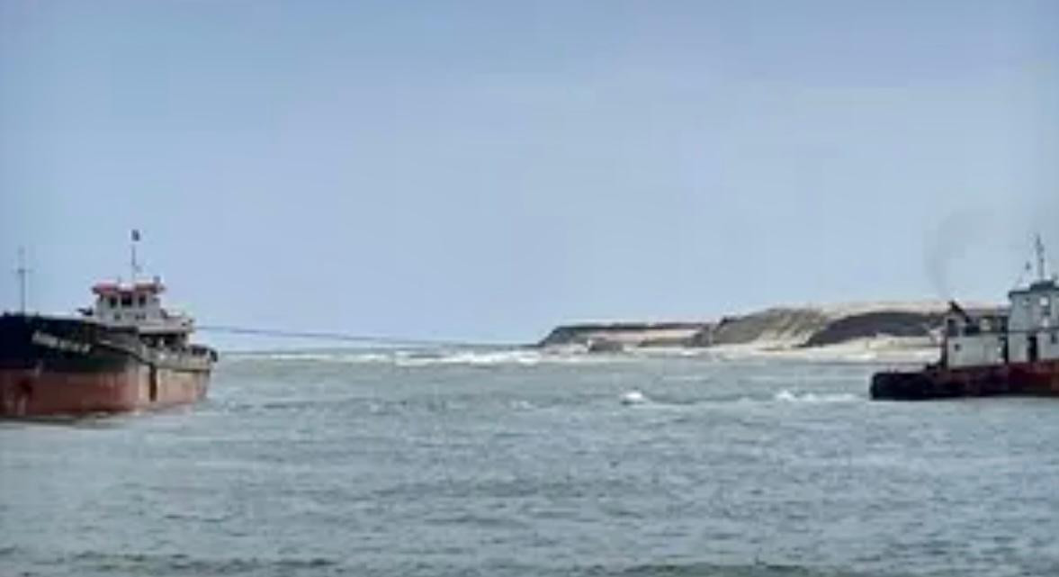 | Tàu hàng Chính Quỳnh 19 mắc cạn được lai dắt vào cảng Cửa Việt an toàn. |