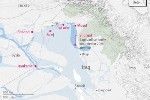 Ở phía bắc Iraq, khu vực quan trọng nhất trong cuộc chiến chống IS, các quan chức tình báo Iraq và thủ lĩnh Peshmerga khẳng định họ biết chắc Baghdadi di chuyển rộng ở vùng tây bắc nước này trong những tuần gần đây, đặc biệt tại khu vực gần hai thị trấn Ba'ej và Tal Afar.