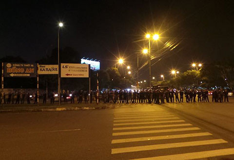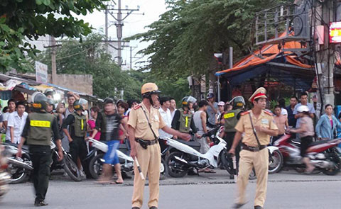 Người dân chỉ còn biết đứng trên vỉa hè quan sát, phía ngoài là hàng trăm chiến sỹ cảnh sát trật tự đứng chốt chặt.