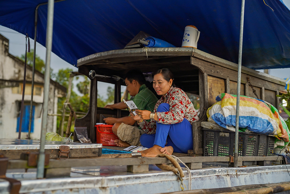 Ở đằng xa, bà Võ Thị Thanh từ Vĩnh Long đến, là thương hồ lâu năm ở chợ nổi này nên hầu như ai cũng biết. Bản thân không có điều kiện học nên nghỉ sớm, lấy chồng rồi đeo nghề buôn bán trên sông cho đến giờ. Chồng ở nhà đi vô vườn mua rồi ở đây bán hết chạy ghe lên chở đem xuống bán; cứ thế kéo dài mấy chục năm nay. Ở đây quanh năm "tay làm hàm nhai" cực khổ mà chẳng dư giả. "Nhiều lúc rảnh rỗi muốn nghĩ tìm cách nào đó để thay đổi cuộc sống khá hơn nhưng không biết phải làm gì. Giờ có được sách quý tôi sẽ đọc để học hỏi cách làm giàu từ người khác", bà Thanh nói.