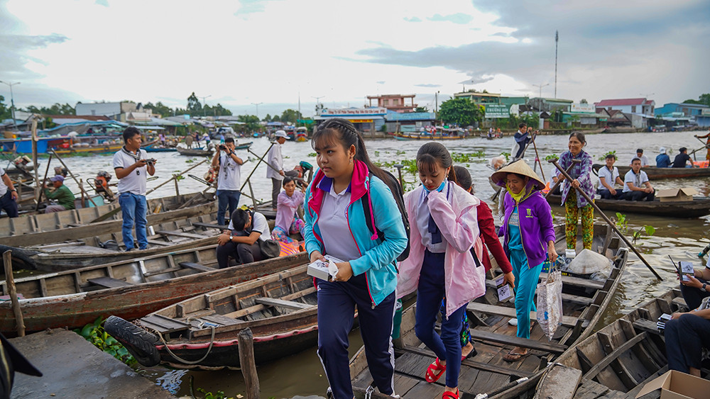 Gần chục chiếc ghe nhỏ được các thành viên của Đoàn Hành trình chia nhau mang đến tận tay trao cho thương hồ quyển sách quý đổi đời. Đây là những quyển sách do Chủ tịch Đặng Lê Nguyên Vũ tâm huyết, cẩn trọng tuyển chọn từ hàng triệu cuốn sách, từ hàng ngàn tấm gương danh vĩ nhân thành công nhất của nhân loại để mang đến tặng cho họ.